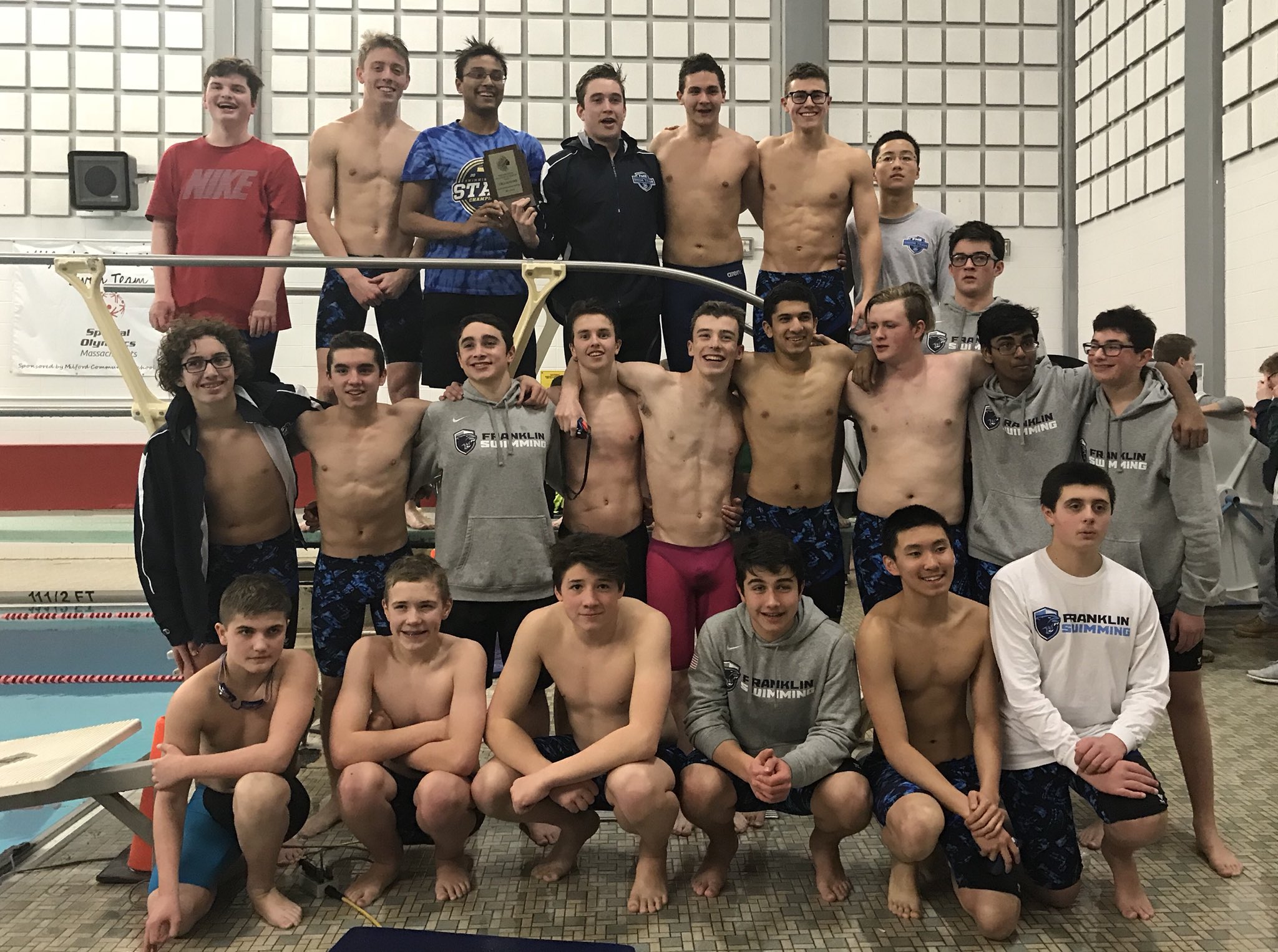 | FHS Boys swim team takes Hockomock Championship in a true team way, only 1 individual 1st place finish but lots of depth |