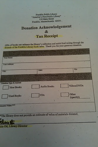 I recently read your blog posting about the Franklin Public Library.  There is a section in the blog posting where you shared that book donations to the public library are not tax deductible.  I would like to direct you to review IRS Publication 526 for clarification.  I also consulted a CPA in the town of Franklin that concurs with this publication that books donated to the Franklin Public library are tax deductible.  Our beloved Franklin Public Library falls under this category and all books donated to the library are tax deductible.  Please share with your readers that all books donated to the library are tax deductible per IRS publication 526 and ask them to support the Franklin Public Library with their book donations.  Please make any corrections to the BLOG entry to avoid confusion with your readers or with other new sources that graciously reprint the postings.